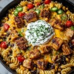 This Autumn Harvest Chili Chicken Mac Skillet is a comforting one-pan meal that combines tender chicken, hearty elbow macaroni, and festive fall flavors like chili powder, smoked paprika, and cumin. Loaded with black beans, corn, and diced tomatoes with green chilies, it’s a deliciously spicy, cheesy dish perfect for cozy autumn evenings.