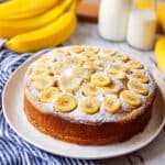 The image shows a round banana cake on a white plate, with a single thick layer. The cake has a golden brown base and is topped with a layer of sliced bananas arranged closely together, creating a textured pattern. A light dusting of powdered sugar covers the banana layer, adding a touch of white contrast. The plate sits on a white marbled surface with a blue and white striped cloth nearby. There are whole bright yellow bananas and a glass bottle of white milk in the background. Photo taken with an iphone --ar 4:5 --v 7