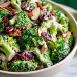 A crisp and flavorful broccoli salad featuring a tangy mayonnaise dressing, sweet dried cranberries, crunchy almonds, and savory bacon, perfect as a refreshing side dish or potluck favorite.