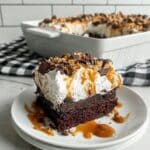 Better Than Sex Cake is a decadent and indulgent dessert featuring a moist devil’s food cake base soaked with sweetened condensed milk and caramel syrup, topped generously with whipped cream and crunchy crushed Heath candy bars for a perfect balance of creamy, sweet, and crunchy textures.