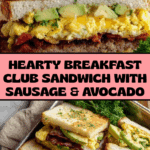 This hearty Breakfast Club Sandwich features crispy oven-baked bacon, juicy pan-seared pork sausage patties topped with melted cheddar, creamy scrambled eggs, fresh avocado slices, and a flavorful spread of cowboy butter layered between toasted white bread slices. Perfect for a filling morning meal, these sandwiches are assembled with care for balanced textures and rich, savory flavors.