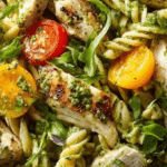 A vibrant and customizable pesto pasta salad featuring farfalle pasta, toasted pine nuts, fresh basil, and a zesty lemon dressing. Tossed with colorful vegetables like cherry tomatoes, sweetcorn, peas, and peppery rocket, it’s an ideal light meal or side dish perfect for warm days or entertaining.