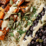 These Chili-Lime Sweet Potato & Black Bean Bowls are a vibrant, nutritious meal that combines smoky roasted sweet potatoes with a zesty black bean salsa. Topped with a spicy yogurt drizzle and crunchy pumpkin seeds, they’re perfect for a satisfying lunch or dinner that’s full of flavor and texture.