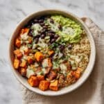 This vibrant and flavorful Chili-Lime Sweet Potato & Black Bean Bowl is a wholesome plant-based meal perfect for lunch or dinner. It features smoky roasted sweet potatoes, a zesty black bean salsa infused with fresh lime and spices, creamy avocado, and a spicy yogurt drizzle, all served over nutrient-rich quinoa or brown rice. This recipe is packed with protein, fiber, and bold flavors, making it a satisfying and healthy bowl that’s easy to prepare and perfect for meal prep.