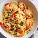 Store any leftover shrimp scampi in an airtight container in the refrigerator for up to 2 days. Reheat gently on the stove or in the microwave to avoid toughening the shrimp. It’s best enjoyed fresh but can be frozen for up to one month if needed.