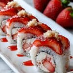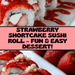 Keywords: strawberry shortcake, sushi roll dessert, no-bake dessert, cream cheese filling, sponge cake roll, fresh strawberries, party dessert, easy dessert