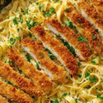 Crispy Chicken Fettuccine Alfredo is a delightful twist on a classic Italian favorite. Tender, breaded chicken cutlets add a satisfying crunch to the rich, creamy Alfredo sauce and perfectly cooked fettuccine. It’s a comforting meal that’s sure to impress family and friends.
