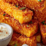 Crispy and melty mozzarella sticks coated with a flavorful seasoned panko breadcrumb crust. These golden fried appetizers are perfect for snacking or serving with your favorite dipping sauce.