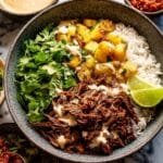 7. Assemble Bowls: To serve, layer the bowls with cooked rice, shredded chipotle pineapple pot roast, black beans, corn, chopped bell pepper, sliced avocado, and sprinkle with fresh cilantro. Add lime wedges on the side for squeezing over the bowls.