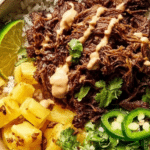 This Crockpot Chipotle Pineapple Pot Roast Bowl is a flavorful and hearty meal featuring tender slow-cooked beef chuck roast infused with smoky chipotle peppers and sweet pineapple. Served over a bed of rice with black beans, corn, fresh veggies, and avocado, it’s a perfect easy-to-make bowl that balances smoky, sweet, and savory flavors with a fresh finish.