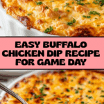 This Easy Buffalo Chicken Dip is a creamy, spicy, and cheesy appetizer perfect for parties or game day. Featuring shredded chicken mixed with cream cheese, Frank’s Red Hot sauce, ranch dressing, and cheddar cheese, it bakes to a bubbly, melty perfection and is delicious served warm with chips, crackers, or fresh veggies.