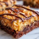 Delightfully rich and sweet, these Easy Samoa Brownies combine fudgy brownie base with toasted coconut, luscious caramel topping, and a drizzle of melted chocolate for a decadent treat inspired by the classic Samoa cookie flavors.