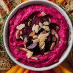 This vibrant Fresh Beet Hummus combines the earthy sweetness of beets with creamy chickpeas for a colorful and nutritious twist on classic hummus. Blended with tahini, garlic, lemon juice, and olive oil, and topped with feta, parsley, and almonds, it makes a perfect appetizer or snack served alongside toasted crostini or fresh vegetables.