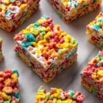 Keywords: Fruity Pebbles, Rice Krispie Treats, marshmallow dessert, easy no bake, colorful snack, party treat