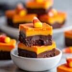 The image shows a stack of square fudge pieces arranged in a white bowl, each piece having two distinct layers. The bottom layer is thick and dark brown with a rich, smooth texture, while the top layer is bright orange, slightly glossy, and softer in appearance. Each square is topped with a small candy shaped like candy corn, featuring yellow at the base, orange in the middle, and white at the tip, nestled slightly into the orange layer. The background is a white marbled texture with blurred orange and white elements that match the candy corn colors. photo taken with an iphone --ar 4:5 --v 7