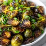 Fresh Brussels sprouts work best because they roast evenly and caramelize well. If using frozen, thaw and pat dry thoroughly before tossing with the dressing to avoid sogginess.