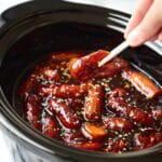 Keywords: little smokies, honey teriyaki, slow cooker recipes, party appetizers, sweet and spicy sausages, pineapple chunks, Asian chili sauce