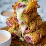 These Keto Crispy Reuben Roll-Ups are a delicious low-carb twist on the classic Reuben sandwich. With crispy melted Swiss cheese as the base, they are filled with savory corned beef, tangy sauerkraut, and a creamy, flavorful dressing. Perfect as a snack or appetizer for keto and low-carb diets, these roll-ups are quick to prepare and satisfy cravings without the carbs.