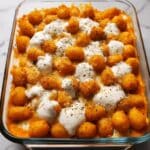 This Loaded Buffalo Chicken Tater Tot Bake is an easy, crowd-pleasing dinner recipe that combines tender shredded chicken in spicy buffalo sauce with creamy cheeses and crispy tater tots. Baked until golden and bubbly, it’s topped with ranch dressing and green onions for a perfect balance of flavors and textures. Ideal for busy weeknights or casual gatherings.