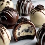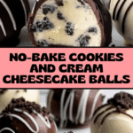 Keywords: no bake cheesecake balls, cookies and cream cheesecake, no-bake desserts, Oreo cheesecake bites, easy cheesecake balls, party dessert, chocolate dipped cheesecake