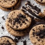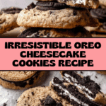 Delicious Oreo Cheesecake Cookies featuring a creamy cheesecake filling nestled inside rich, soft Oreo-studded cookies. These cookies combine the beloved flavors of Oreo cookies with smooth cheesecake, baked to perfection with a slightly golden edge and a cool, creamy center.