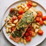 Keywords: Pesto salmon, roasted salmon, white beans, cherry tomatoes, basil pesto, quick healthy dinner, oven baked salmon, Italian salmon recipe