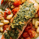This Pesto-Roasted Salmon With Tomatoes and White Beans is a vibrant, healthy one-pan dish featuring tender salmon fillets topped with fragrant basil pesto, roasted cherry tomatoes, and creamy white beans. Perfectly baked in the oven, this meal combines rich flavors with simple preparation for a satisfying and nutritious dinner.