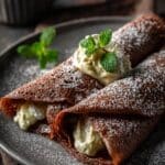 4. Assemble the Crepes: Place a crepe on a plate, spread a generous dollop of chocolate whipped cream over half the crepe, then fold the crepe over or roll it up. Repeat with remaining crepes and serve immediately for a fresh, decadent treat.
