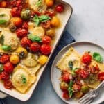 Keywords: sheet-pan ravioli, roasted tomatoes, baked ravioli, Italian recipe, easy dinner, vegetarian pasta