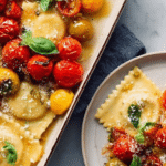 This sheet-pan ravioli with burst tomatoes is a simple, flavorful meal that comes together quickly with minimal cleanup. Roasting the tomatoes and ravioli creates a delightful mix of crispy textures and rich, juicy flavors perfect for a weeknight dinner.