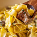 Slow Cooker Beef and Noodles is a hearty and comforting dish featuring tender seared stew beef slow-cooked in a savory mixture of ranch seasoning, brown gravy, cream of mushroom soup, and chicken broth, enhanced with garlic and onion powder. Egg noodles are added near the end of cooking for a perfect creamy, flavorful finish, making it an effortless and satisfying meal for any day of the week.