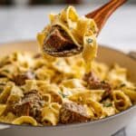 Slow Cooker Beef and Noodles is a hearty and comforting dish featuring tender seared stew beef slow-cooked in a savory mixture of ranch seasoning, brown gravy, cream of mushroom soup, and chicken broth, enhanced with garlic and onion powder. Egg noodles are added near the end of cooking for a perfect creamy, flavorful finish, making it an effortless and satisfying meal for any day of the week.