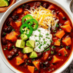 This Sweet Potato Chili is a hearty and flavorful vegetarian dish packed with warming spices and nutritious ingredients. Sweet potatoes, black beans, and a medley of tomatoes come together to create a comforting chili that’s perfect for cozy dinners. The dish is simmered on the stovetop, developing rich layers of taste with chili powder, cumin, and oregano, making it both healthy and satisfying.