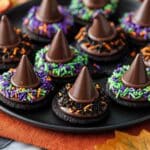 Delight in these adorable and festive Oreo Witch Hat Cookies, perfect for Halloween celebrations. Each cookie features a classic double-stuffed Oreo topped with a chocolate candy kiss and decorated with colorful Halloween sprinkles using a smooth chocolate dip to hold it all together.