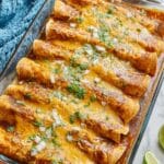 Store leftover enchiladas in an airtight container in the refrigerator for up to 3 days. Reheat in the oven at 350˚F until warmed through to maintain the crispy edges. You can also microwave individual portions covered with a damp paper towel, but this may soften the tortilla.