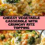 This comforting Vegetable Casserole combines creamy mushroom soup, cheesy broccoli and mixed vegetables, and cooked rice into a hearty, baked dish perfect as a family-friendly meal or side. Topped with crunchy Ritz cracker crumbs and melted butter, it’s a deliciously satisfying casserole baked to golden brown perfection.